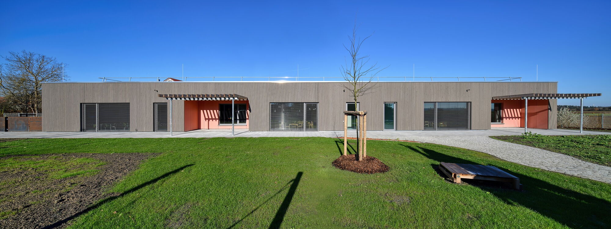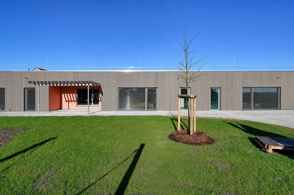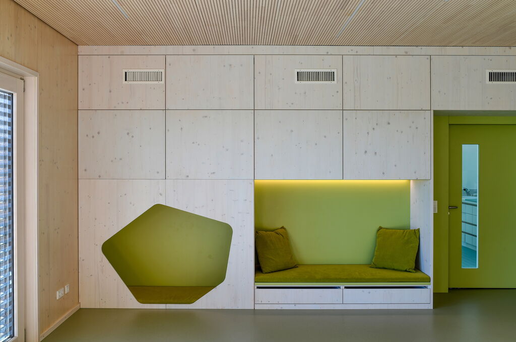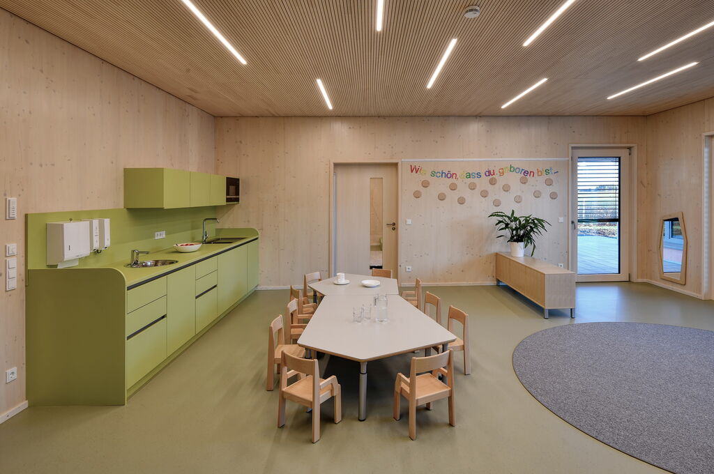 Das neue Gebäude für die zweigruppige Kinderkrippe in Holz-Massivbauweise ist ein herausragendes Beispiel für nachhaltige Architektur und energieeffiziente Bauweise. Die Wände und Decken des Bauwerks bestehen aus rund 1.600 m² Brettsperrholz, das sowohl für seine hohe Stabilität als auch für seine positiven ökologischen Eigenschaften bekannt ist. Das verwendete Brettsperrholz trägt maßgeblich zur Speichermenge an biogenem Kohlenstoff bei, die etwa 199 Tonnen beträgt, was zur Reduktion der CO2-Emissionen und zur Förderung eines nachhaltigen Lebensraums beiträgt.
