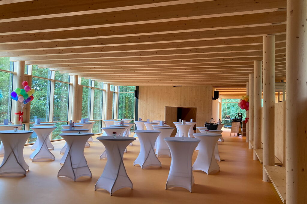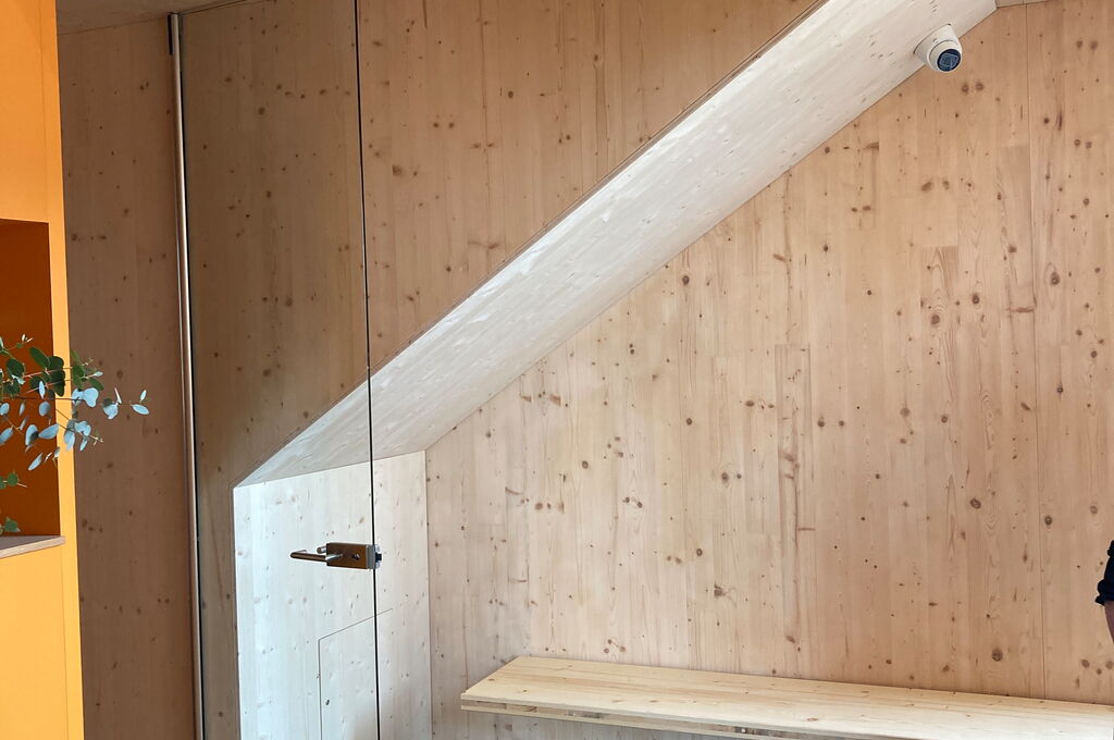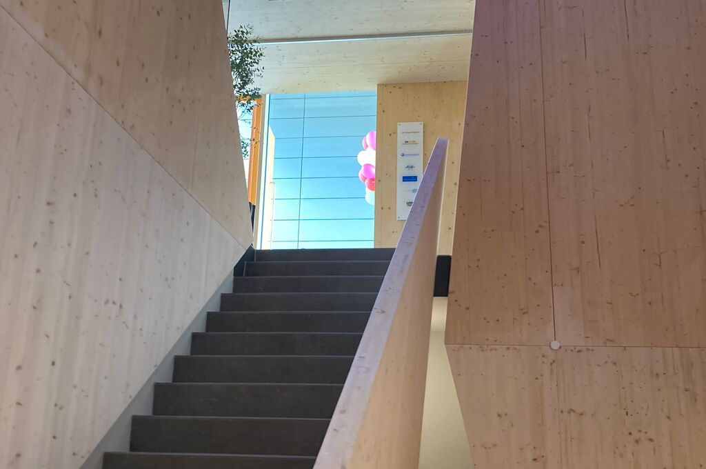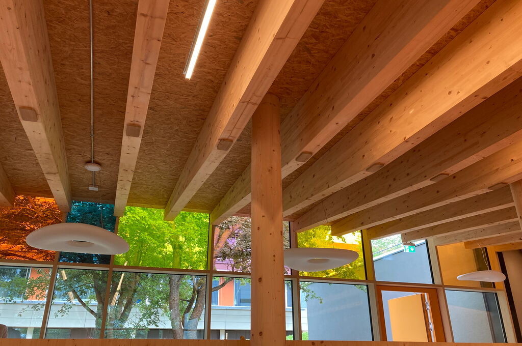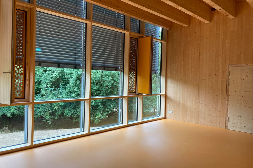 Da nicht nur die Bewegung, sondern auch die Architektur, positiv zur Heilung beitragen soll, wurden heilende Faktoren bei der Gebäudeplanung berücksichtigt. Der bestehende Naturraum konnte ohne Baumfällung beibehalten werden. Die großen Glasfassaden vermitteln den Eindruck, im Wald zu sein und gleichzeitig ist der Bau lichtdurchflutet. Auch bei den Baumaterialien wurde auf die Natur gesetzt. Die Konstruktion besteht aus ca. 1.200 m² KLH® - CLT Massivholzplatten, die überwiegend sichtbar sind. Der Baustoff Holz strahlt Wärme und Geborgenheit aus. Aufgrund der Farbkonstellation wird dieses Empfinden verstärkt, der gelbe Linoleum ergänzt die Holzoptik. Des Weiteren stimulieren die farbigen Gläser der Fassade die Sinne der Besucher. Es gibt keine abgeschlossenen Flure und Gänge, sodass die Übergänge fließend sind. Nicht nur im Inneren ist die Natur gegenwärtig, auch das Flachdach wird für Biodiversität genützt. Die Baukosten von 4,3 Mio. € sind bestens investiert, um die krebskranken Patienten der Uniklinik Regensburg in ihrer Therapie zu unterstützten.
