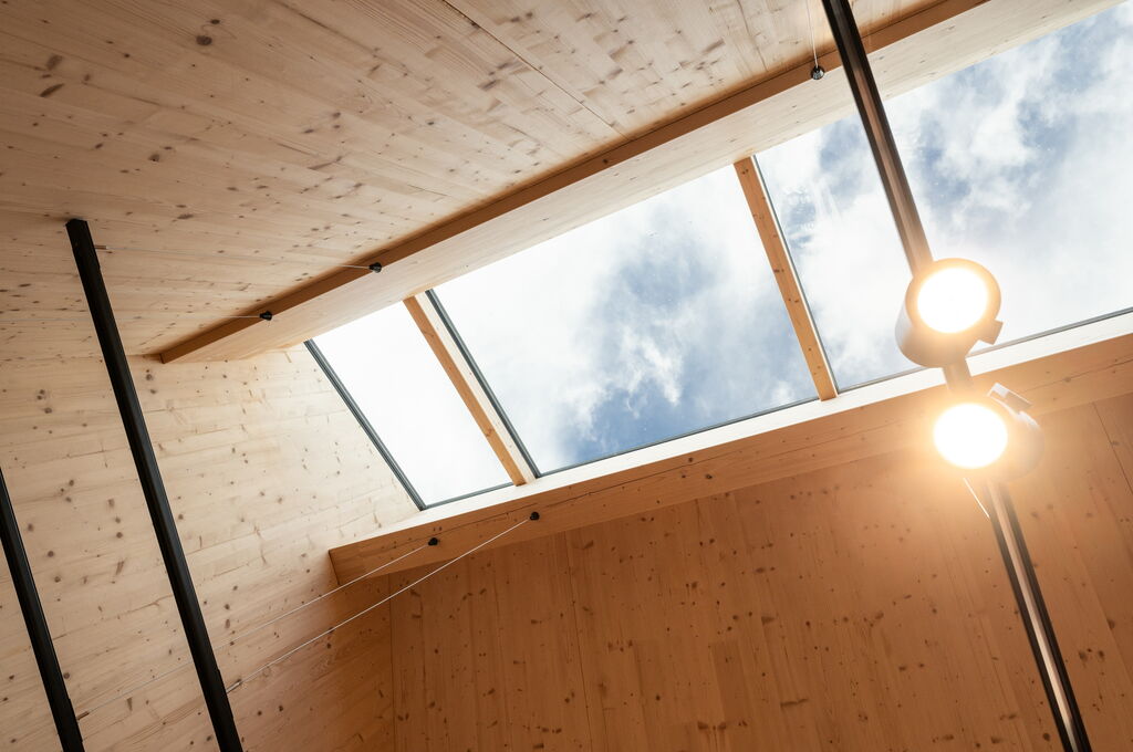 Konstruktiv setzt der Dorfladen auf eine moderne Holzbauweise mit Brettsperrholz von KLH Massivholz. Für Dach und Wände kamen rund 360 m² Brettsperrholz in hochwertiger Wohnsichtqualität zum Einsatz. Das sichtbare Holz prägt den Innenraum maßgeblich und verleiht ihm Wärme, Ruhe und eine einladende Atmosphäre – passend zu einem Ort der Begegnung und des Verweilens.
