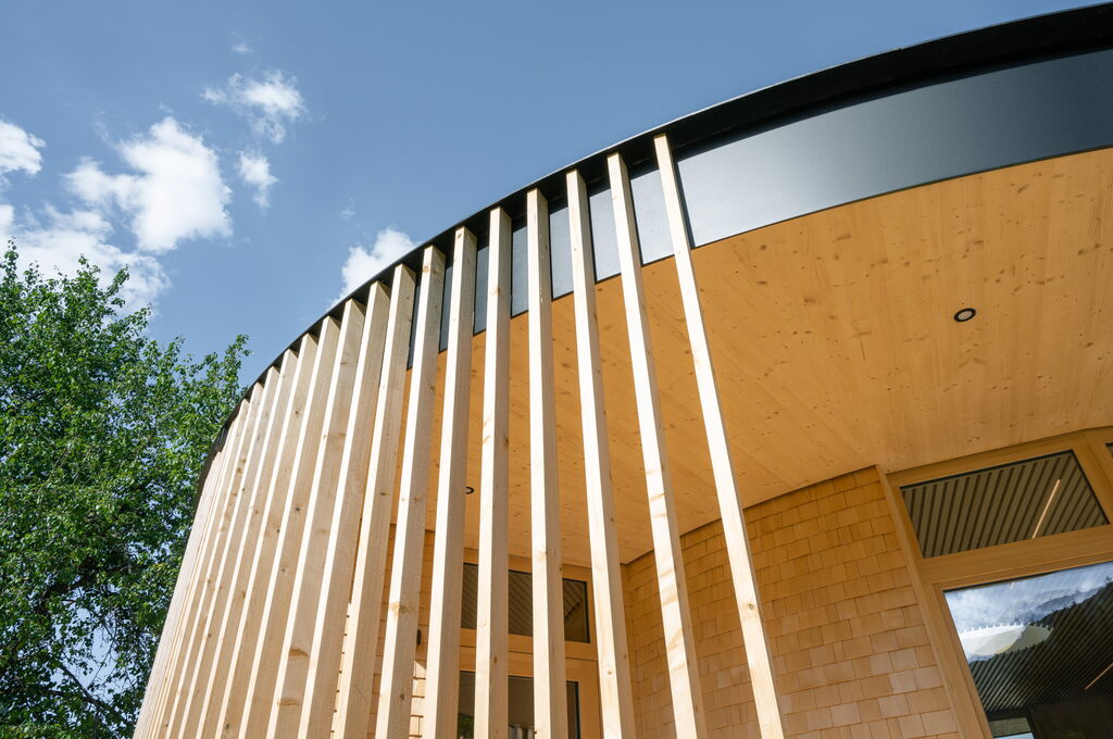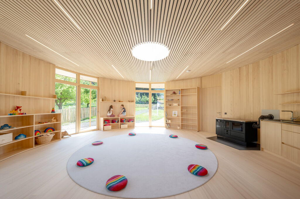 Für das begrünte Dach dienen fünf KLH® - CLT Massivholzplatten mit einer Länge von bis zu 12,80 m als Tragkonstruktion. Hierfür wurden rund 150 m² Brettsperrholz mit einer Stärke von 120 mm und einem 5-lagigen Plattenaufbau verwendet. Die bodentiefen Fenster sowie der Lichteinfall durch Oberlichter an der Decke sorgen für ein helles Erscheinungsbild und einem nahtlosen Übergang zwischen Natur und Gruppenraum. Zusätzlich befinden sich eine Küche, Toiletten, Raum für Erzieher/innen und ein Aufenthaltsraum sowie eine großzügige Garderobe in der Natur-KiTa. Die überdachte Veranda lädt auch bei Regen zum Spielen im Freien ein. Holz kommt als durchgängiges Material zum Einsatz. Neben dem Massivholzdach besteht die Außenfassade aus Fichtenschindeln und der Innenbereich aus Weißtanne Täfer. Auch beim Heizsystem setzt sich dieser Trend fort. So gibt es einen Ofen mit Holzpellets, der außer zum Heizen auch zum Kochen und Backen verwendet wird. Eine weitere Besonderheit bietet dieser Naturkindergarten, es gibt einen Hasenstall mit vier Hasen, die von den Kindergartenkindern versorgt werden.