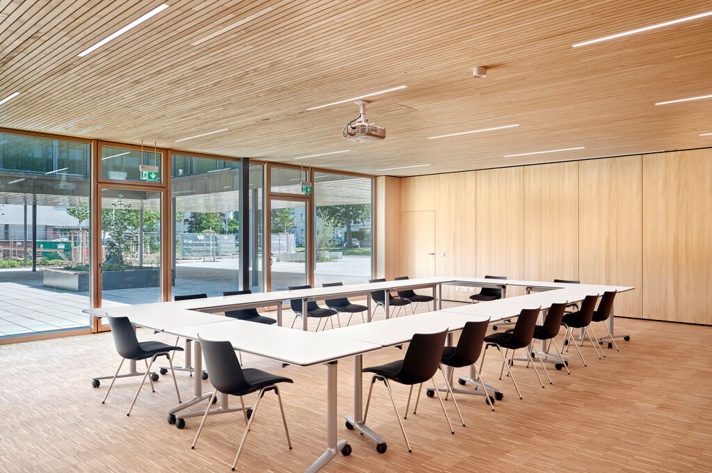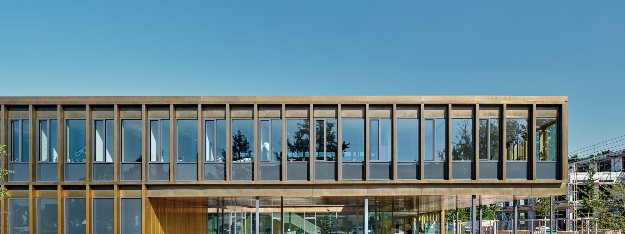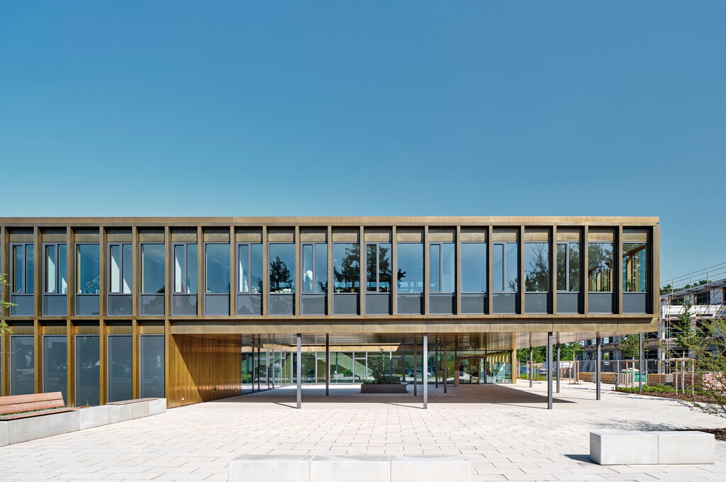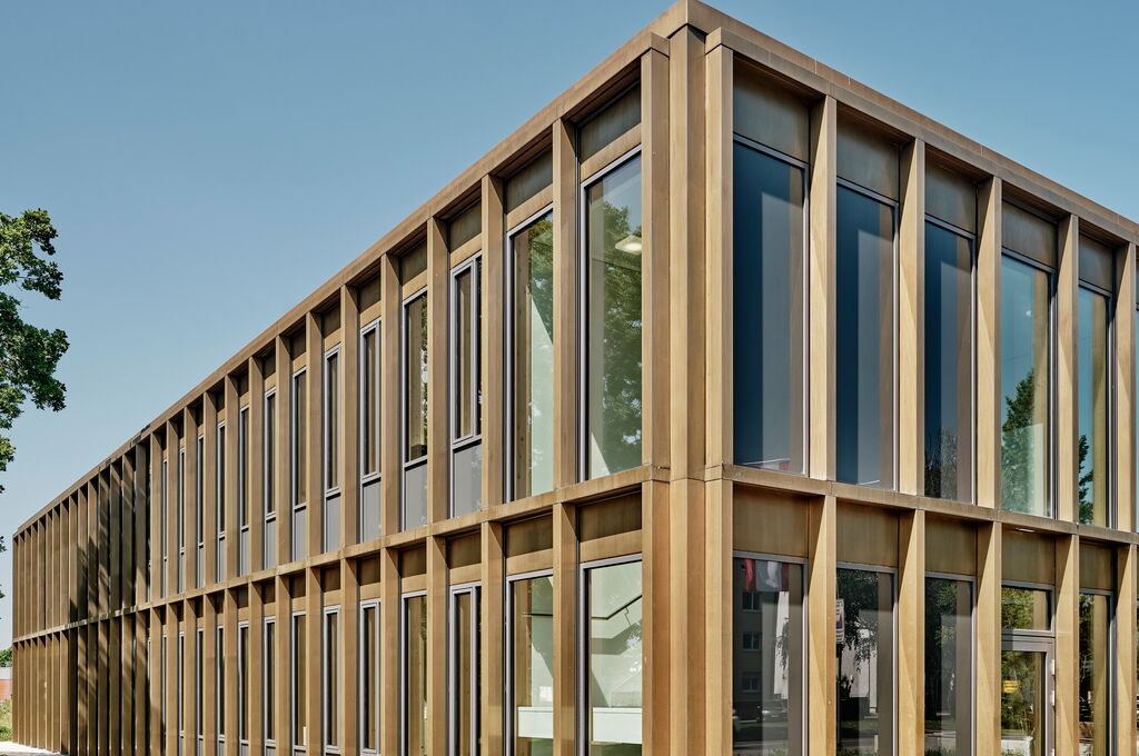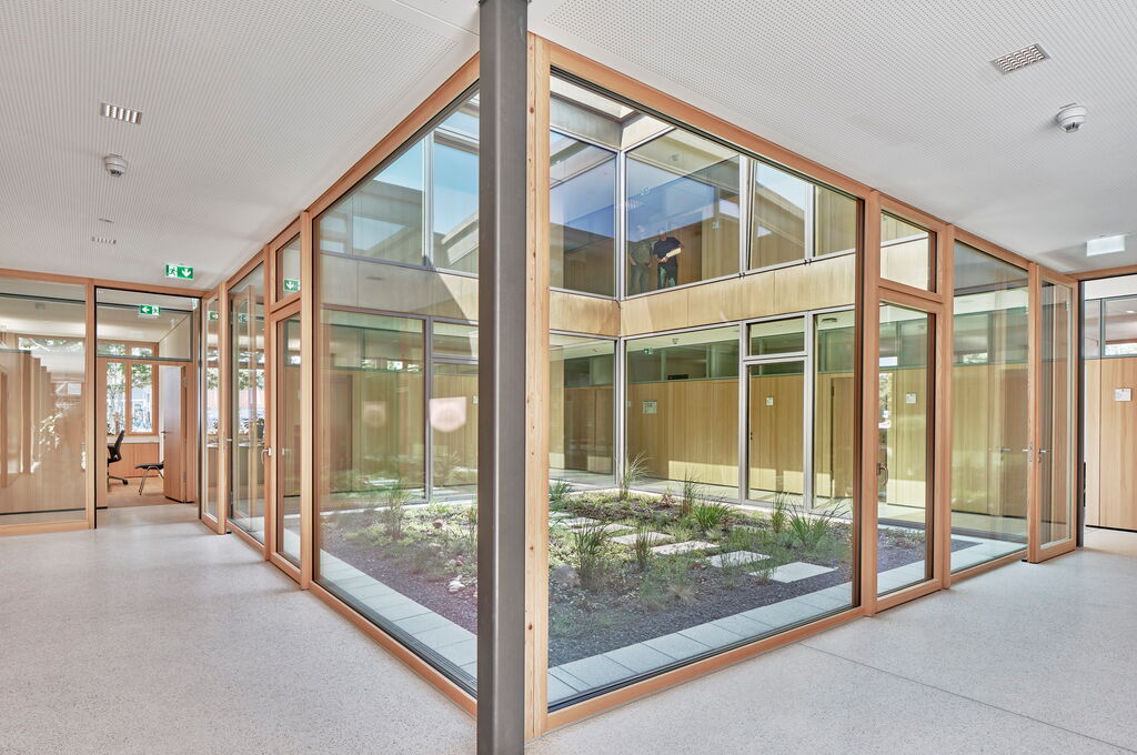 Durch einen weiteren Innenhof scheint das Gebäude allseits von natürlichem Licht durchflutet zu sein. Alle am Bau Beteiligten schufen hier einen Baukörper von großer Leichtigkeit mit herausragender Aufenthaltsqualität. In diesem Sinne ist der Holzbau nicht nur Bestandteil der Konstruktion, sondern auch gestaltendes Element im Innenraum. Die vertikal strukturierte Fassade erhielt eine Verkleidung aus bronzierten Blechen. Das darauf fallende Tageslicht macht das neue Rathaus endgültig zu einem Holzbau-Schmuckstück von hoher architektonischer Qualität und Preiswürdigkeit."