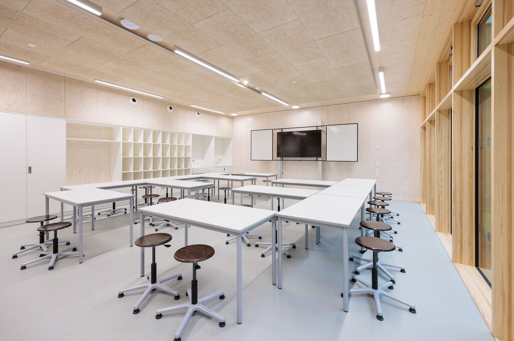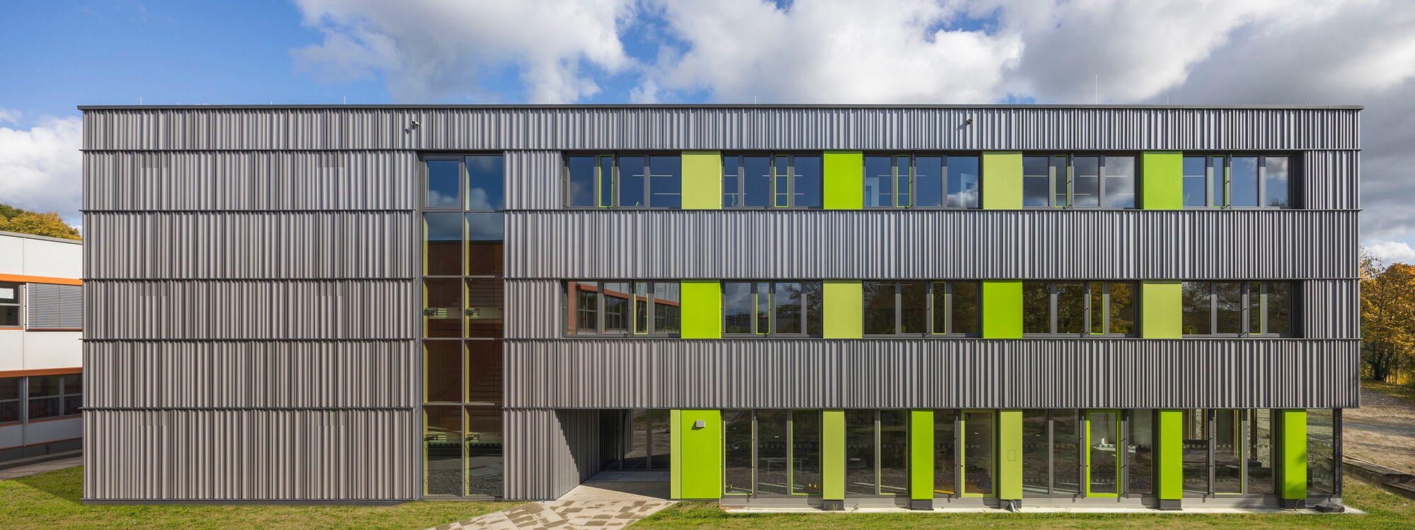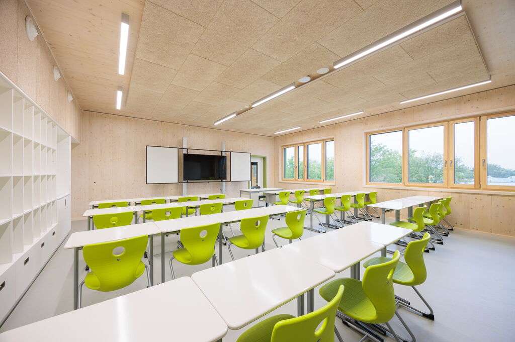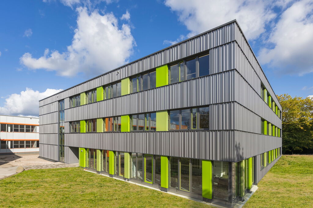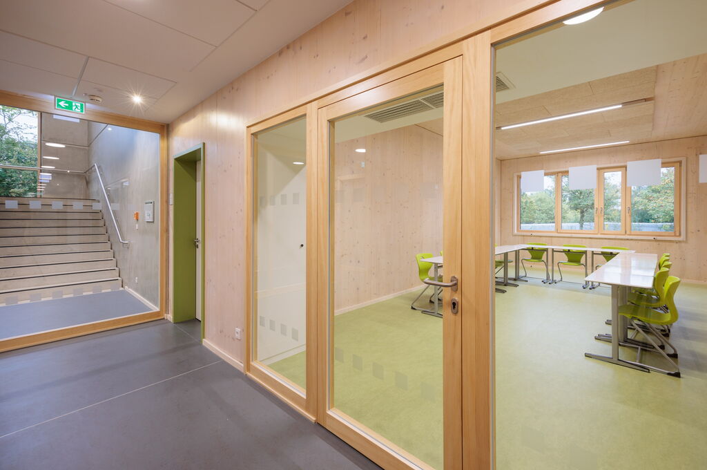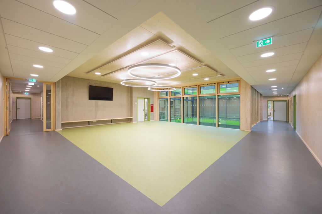 Das Schulzentrum Bad Salzuflen ist ein Paradebeispiel für moderne, nachhaltige Architektur. Der dreigeschossige, quadratische Baukörper misst etwa 36 x 36 Meter und er wurde mit einer beeindruckenden Menge von über 5.000 m² KLH® - CLT Massivholzplatten für Wände und Decken errichtet. Das Gebäude ist nicht nur funktional und energieeffizient, sondern schafft mit seiner Holz-Beton-Hybrid-Bauweise eine warme Atmosphäre.