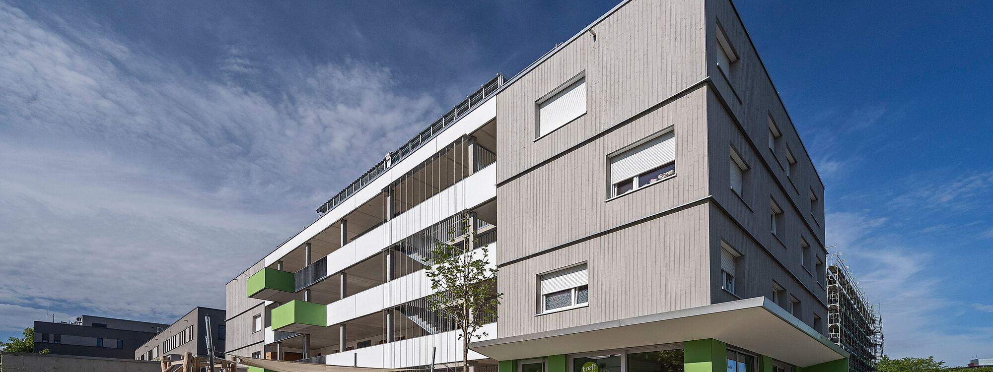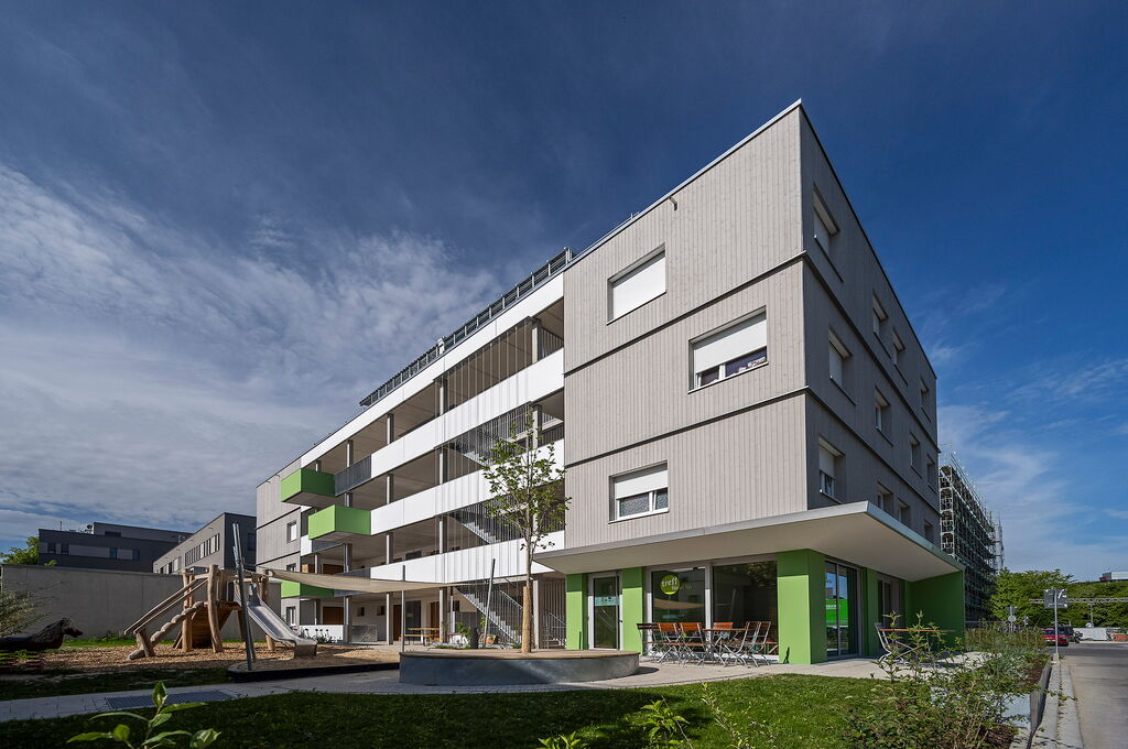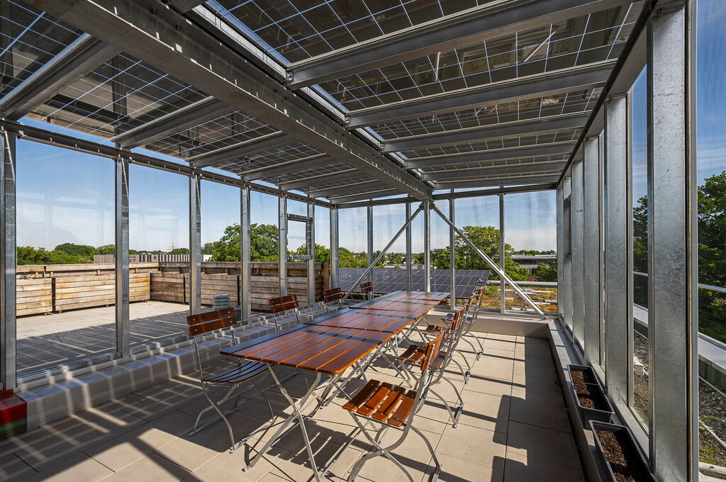Zahlreiche Begegnungsflächen stärken die Hausgemeinschaft: der offene „Treff“ im Erdgeschoss mit Terrasse, ein Spielplatz, Balkone am Laubengang sowie ein kleiner Garten. Highlight ist die große Dachterrasse mit gläserner Orangerie und Hochbeeten, die einen einzigartigen Blick über Augsburg bietet.
