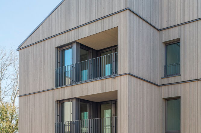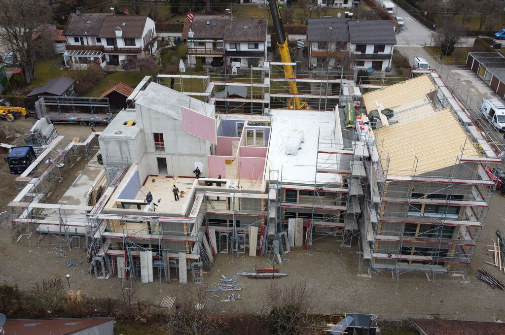 Für das gesamte Bauvorhaben werden 12.000 m² KLH® - CLT Massivholzplatten als Wände und Decken verbaut. Die Innenwände und doppelschaligen Gebäudetrennwände aus KLH®-CLT Massivholzplatten werden im Werk mit Gipskarton- und Gipsfaserplatten beplankt. Außerdem werden Elektrodosen und Leerrohre für die spätere Elektroinstallation werkseitig eingebaut. Anschließend werden die Wände mit den fertigen Gipsoberflächen auf die Baustelle geliefert. Durch die Kombination von Holz und Gips werden die Schall- und Brandschutzanforderungen für diese Gebäudeklasse erfüllt. Der hohe Vorfertigungsgrad trägt auch dazu bei, dass Trocknungsphasen entfallen und die Bauzeit somit verkürzt werden kann. Die Außenwände in Holzständerbauweise kommen mit bereits eingebauten Fenstern von der Zimmerei Höfle, welche die regendichte Hülle als Gesamtauftrag abwickelt.