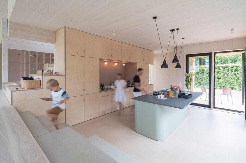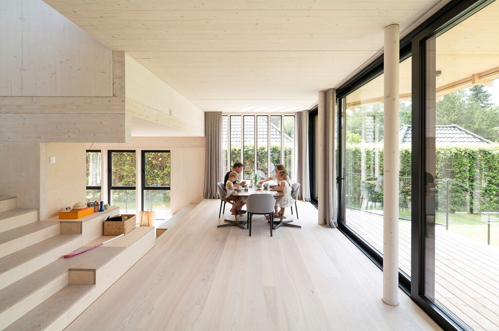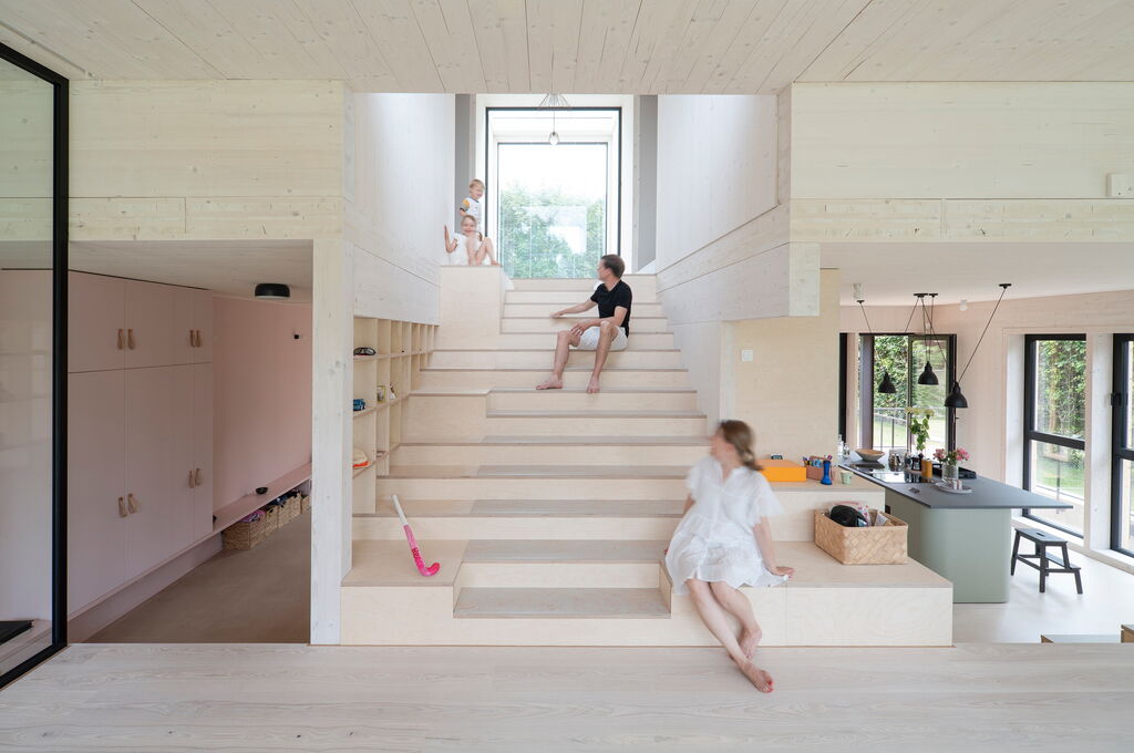 Der Mittelpunkt des Gebäudes ist das offen gehaltene Erdgeschoss, in dem alle Wohnräume frei um einen mittigen Kern angeordnet sind. Durch Höhenversätze werden unterschiedliche Bereiche mit vielseitigen Blickbeziehungen geschaffen, ohne die Offenheit einzuschränken. Die Treppenanlage ist nicht nur Verkehrsfläche, sondern verbindet die Ebenen und Räume durch die offene Gestaltung und wird durch integrierte Sitzflächen und Podeste zum eigenen Aufenthaltsbereich.