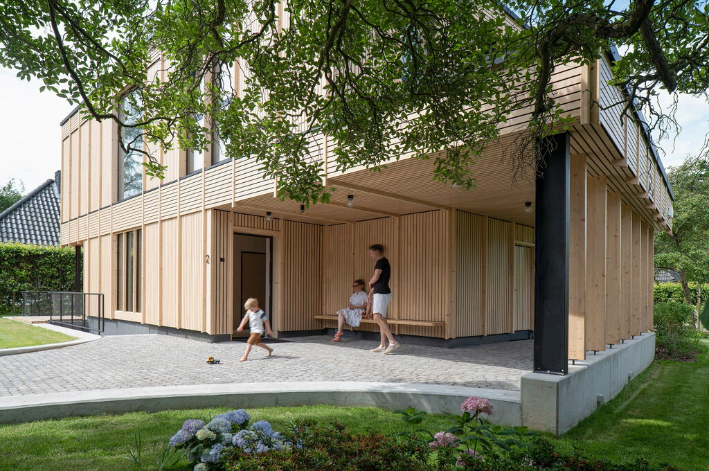 Das Wohnhaus wurde weitestgehend mit nachhaltigen und ökologischen Baustoffen und mit hohem Vorfertigungsgrad errichtet. Die Wände und Decken aus Brettsperrholz bleiben unverkleidet, die verschiedenen Aufbauten der Holzbauteile mit ihren Schichtungen und Fügungen sind das gestalterische Hauptmerkmal. Auch nach außen zeigt sich die Holzbauweise durch die Fassaden aus Weißtanne. Durch einen Wechsel aus geschlossenen und weit geöffneten Feldern, aus horizontalen und vertikalen Schalungen, und durch die in den Achsen angeordneten hervorstehenden Pfosten, werden die Fassaden in einem umlaufenden Rhythmus gegliedert und vermitteln einen Eindruck von den dahinter liegenden Raumzusammenhängen. Durch den Einsatz einer Wärmepumpe in Kombination mit einer Photovoltaikanlage konnte dem Wunsch entsprochen werden, auf den Einsatz von fossilen Brennstoffen zu verzichten.