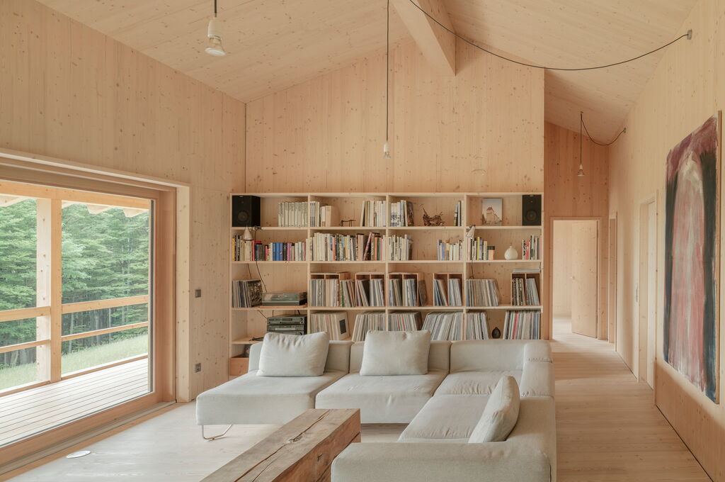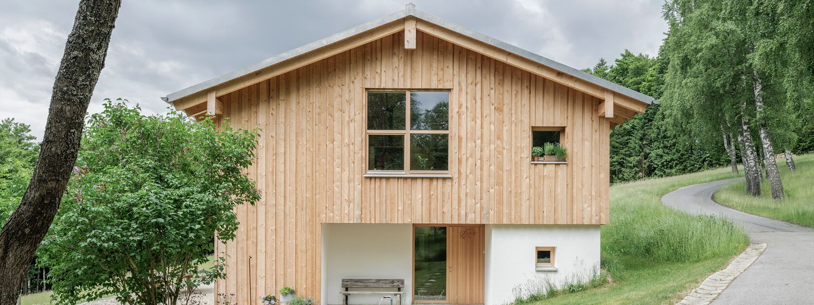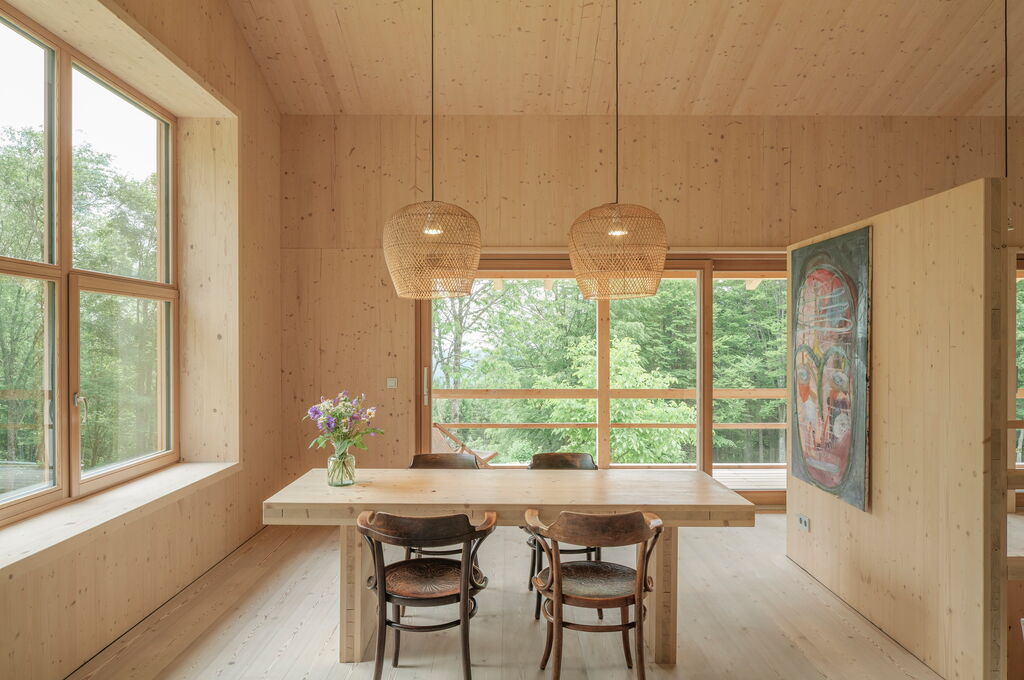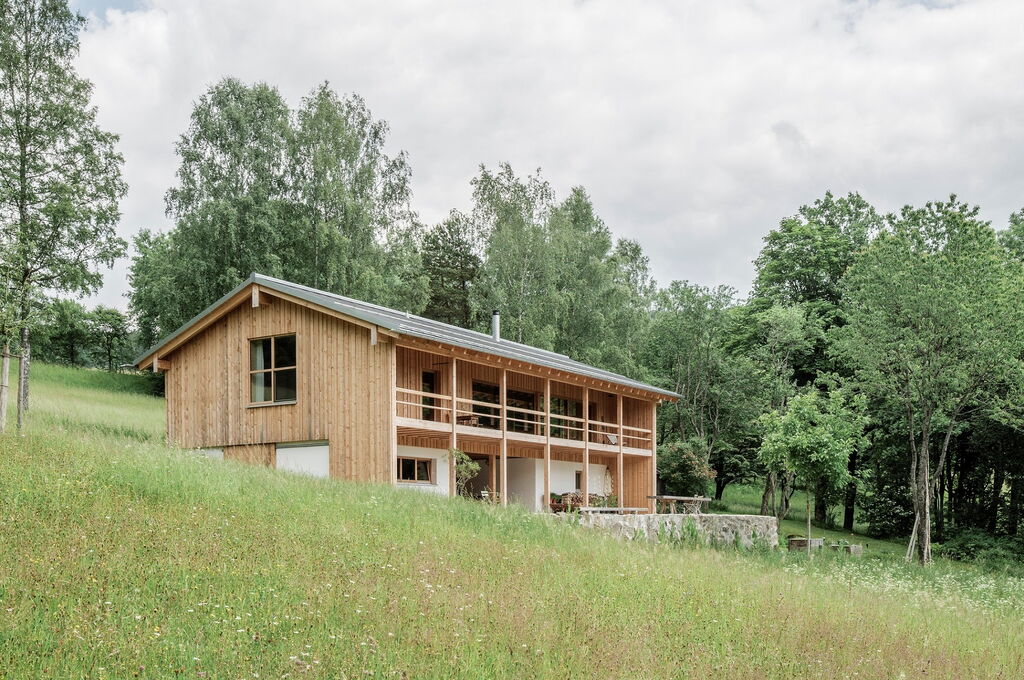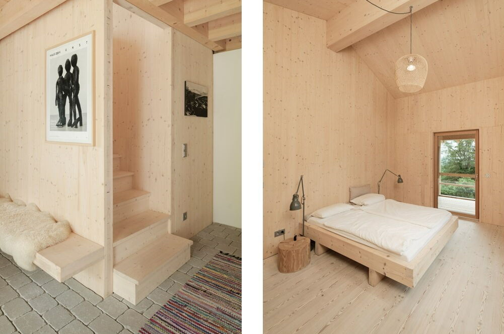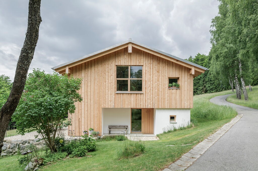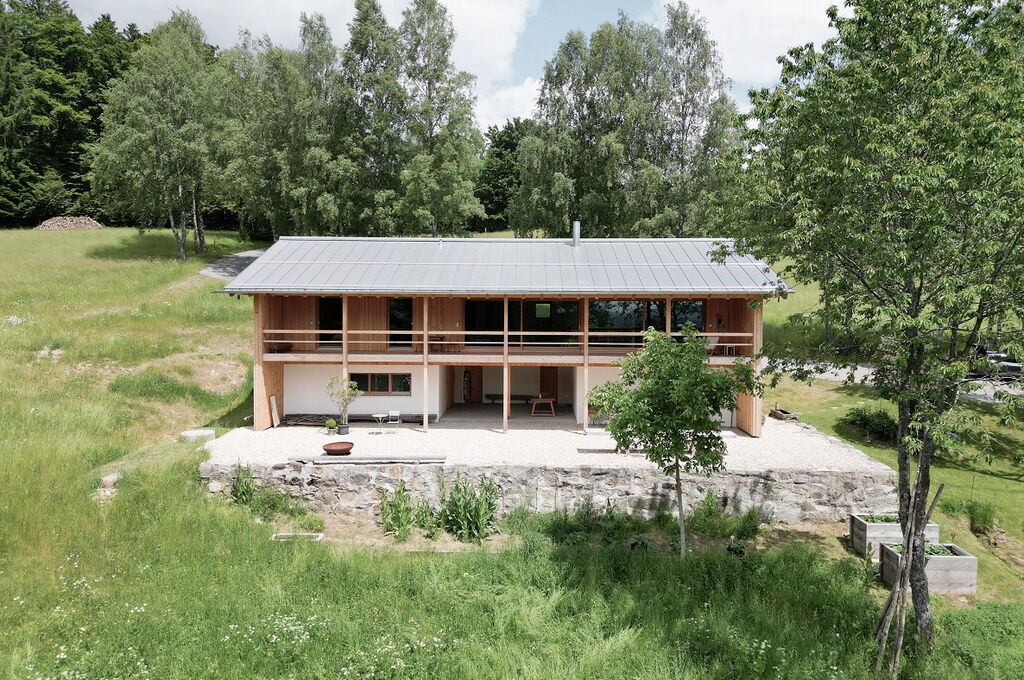 Der Bauherr, in diesem Fall auch gleichzeitig der Architekt des Objekts, hat sich bewusst für folgende Gestaltungsansätze entschieden, die das Haus architektonisch interessant machen. Das Erdgeschoss wurde als „kalter“ Massivbau im Hang ausgeführt, gegensätzlich dazu befindet sich im Obergeschoss der „warme“ Holzbau, welcher somit nicht in Berührung mit Boden, Nässe und Schnee steht. Der gesamte Wohnbereich ist auf einer Ebene, die sich über die Landschaft erhebt und als offener Grundriss mit freier Raumzonierung gestaltet wurde. Der scheunenartige Wohnraum wird auf der Südseite mit einer Loggia als Erweiterung des Wohnraums in die Landschaft ergänzt. Die Loggia dient als natürlicher Sonnenschutz im Sommer und im Winter profitiert man von der tief stehenden Sonne bis weit in den Wohnbereich. Die großzügigen Fensteröffnungen laden zum Ausblick in die Landschaft ein.