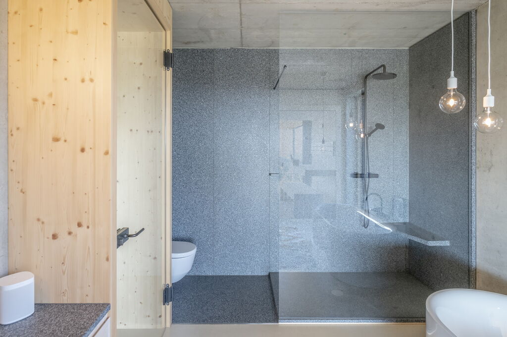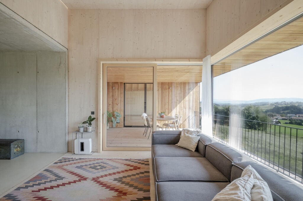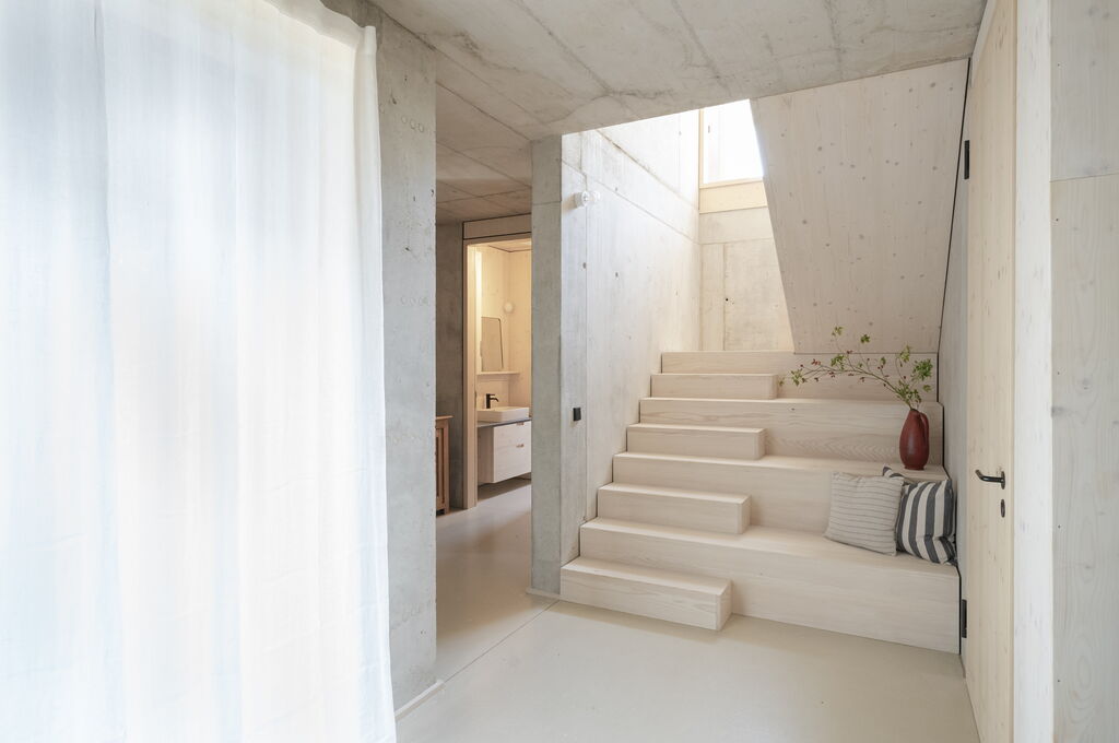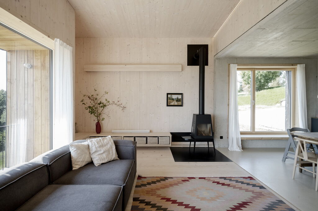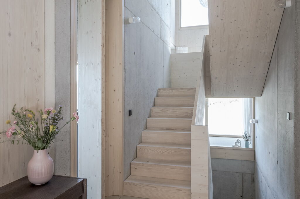 Im Inneren ist ein spannender Materialmix aus Holz, Beton und Glas auf 495 m² Brutto-Grundfläche vorzufinden. So wurden neben Wänden und Decken aus Sichtbeton Decken, Wände und Dachelemente aus KLH® - CLT Massivholzplatten verbaut. Hierfür wurde über 900 m² Brettsperrholz eingesetzt, das überwiegend in entsprechender Oberflächenqualität sichtbar ist. Die Außen- und Innenwände sind 60 mm bzw. 100 mm stark. Für die Decke wurde ein fünflagiger Aufbau mit 180 mm Stärke gewählt. Das Pultdach besteht aus zwei unterschiedlichen Plattentypen, einer fünflagigen 160 mm dicken Platte und einer siebenlagigen 240 mm starken, die den Sonderaufbau 7ss aufweist. Somit sind die äußeren Decklagen jeweils in gleicher Plattenrichtung angeordnet. Die KLH® - CLT Massivholzplatten wurden mit drei LKW Ladungen angeliefert und verfügten bereits über Durchbrüche, Elektrodosen und bauseitig benötigten Schlitzen für die weitere Installation.