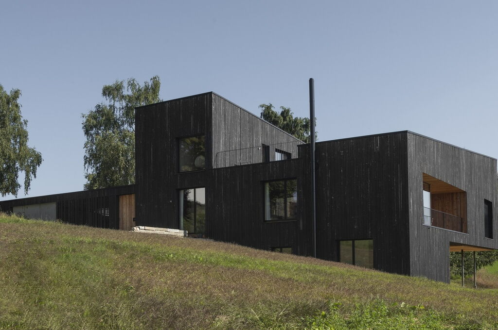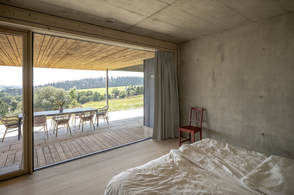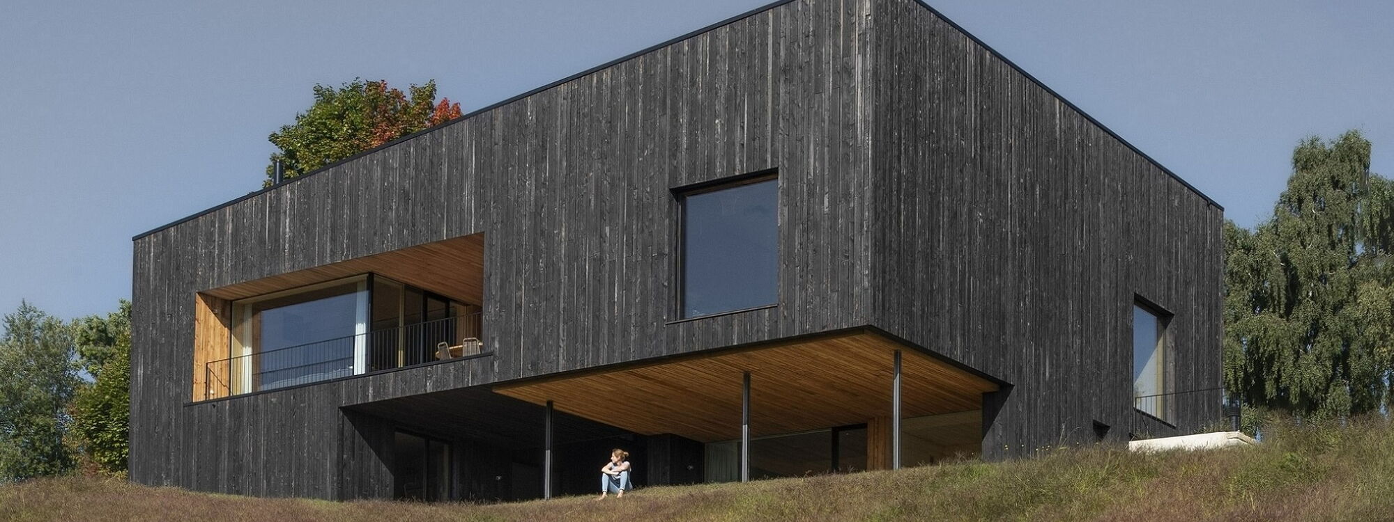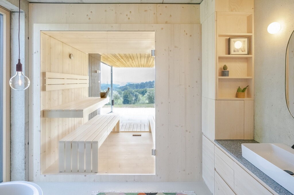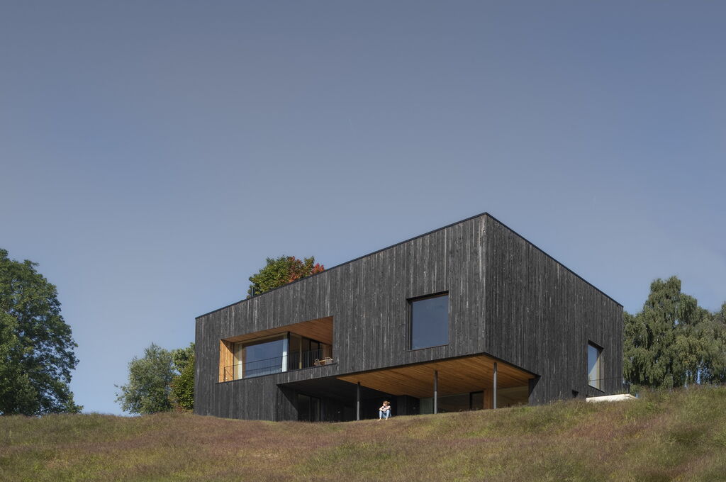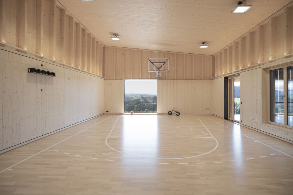 Mit diesem Einfamilienhaus haben sich die Bauherren einen Kindheitstraum erfüllt, eine eigene Turnhalle mit 100 m² Fläche schließt sich an das Wohnhaus an. Architektonisch bilden beide Bereiche eine optische Einheit, da gesamtheitlich eine geflammte Fassade mit großen Fensterelementen vorzufinden ist. Die Dachform wird von zwei gegenläufigen Pultdächern bestimmt, die sich in die Landschaft des Bayerischen Waldes einfügen.
